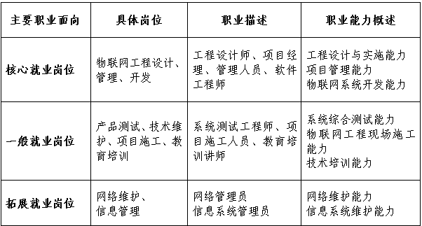 【培养目标】:本专业融合了信息技术、物联网核心技术、机器人技术和网络技术等多个方面的知识体系,培养具有扎实的物联网理论知识,掌握物联网技术工程领域的设计、开发、实施和维护等技能,具备物联网系统集成及应用开发的技术能力,具有良好的职业道德、敬业精神和团队精神,适应区域物联网建设需要的的高素质应用型、技术技能型、复合型人才。