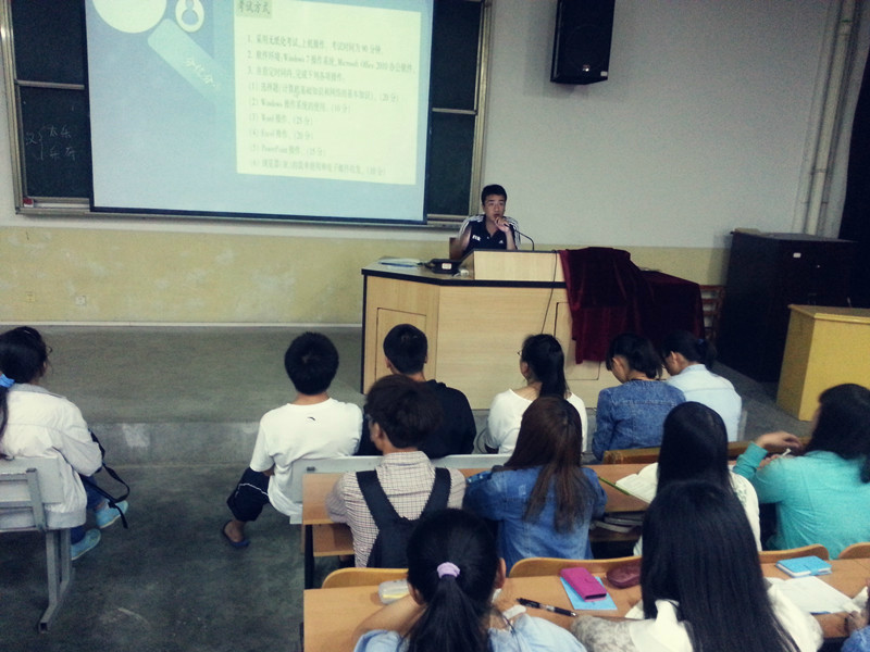 (图/文 吴纯浪)2014年4月11日晚,由信息科学与技术系计算机文化基础与现代教育技术教研室主任穆俊老师主讲的“NCRE (一级、二级MS-OFFICE)应试技巧”专题讲座在博雅楼214教室举行。讲座现场座无虚席,气氛热烈,不少没有座位的同学站着听完了整场讲座。